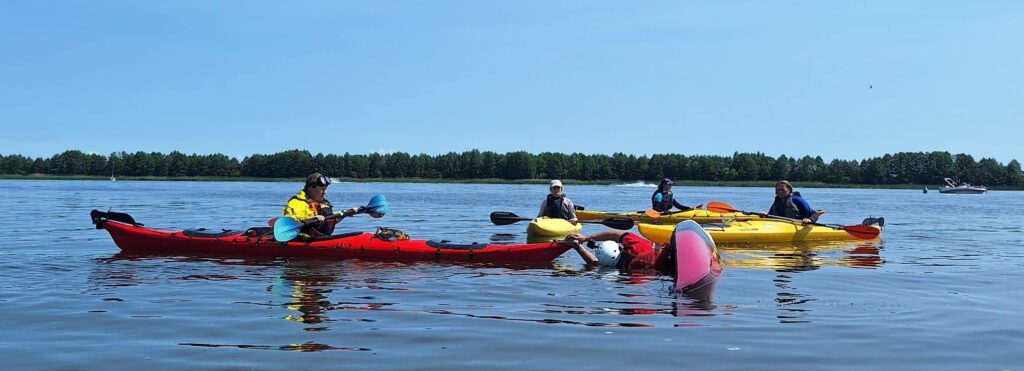 - manewrowanie kajakiem (techniki skręcania, kontra sterująca, naciąganie, pływanie w przechyle, podpórka niska/wysoka),
